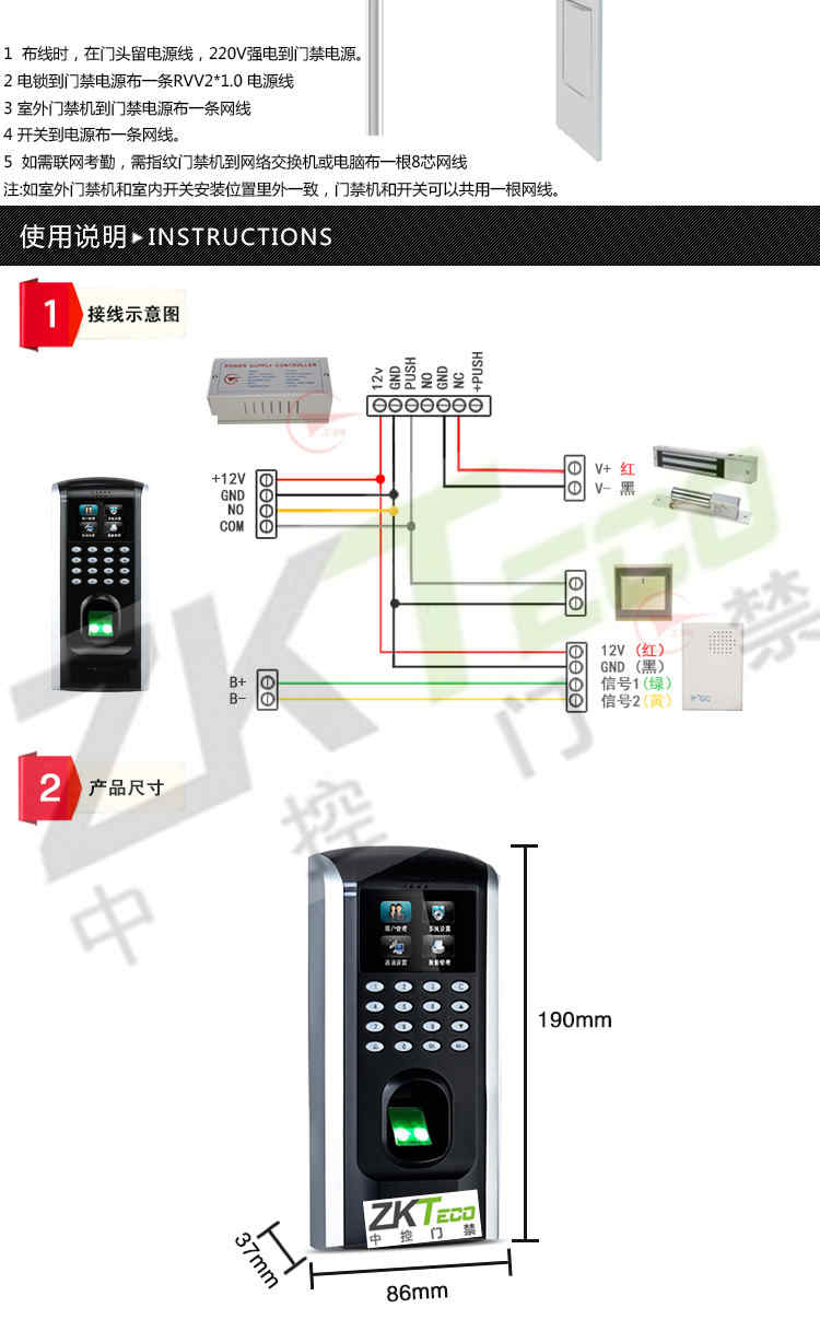 F7接線都按照標(biāo)準(zhǔn)辦公室門禁設(shè)備要求,可直接兼容原先布線和電鎖、供電電源等,直接將F7換下感應(yīng)或密碼門禁即可,僅需1小時(shí)左右。