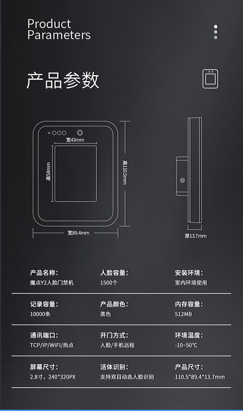 魔點(diǎn)Y2智能人臉考勤門禁搭載海思處理器和智能雙攝,配2.8寸觸摸屏,識(shí)別速度僅0.3秒,離線支持1500張人臉容量。 雙目合璧 活體防偽 采用混合光譜技術(shù),活體防偽,抵御圖像攻擊 突破地域限制 跨區(qū)域考勤數(shù)據(jù)云端實(shí)時(shí)同步 考勤數(shù)據(jù)一鍵生成,手機(jī)可查,輕松便捷 出差,遲到、缺卡,各種出勤狀況清晰匯總 擺脫空間束縛 支持多場景安裝 玲瓏身材,支持玻璃、大理石、乳膠漆等多種墻面安裝,適配更多樣,使用更便捷